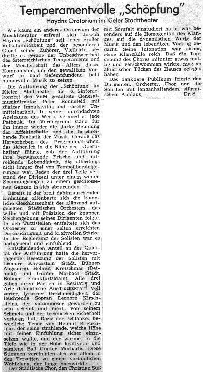 Jede Aufführung der „Schöpfung“ aber steht und fällt mit der Qualifikation der Solisten, die hier (zumindest quantitativ) mehr zu sagen haben als in anderen Oratorien. Daß diesmal eine besonders glückliche Wahl getroffen wurde, bestimmte den künstlerischen Rang der Aufführung entscheidend mit. Leonore Kirschstein, deren perfekt kultivierten Sopran man auf der Kieler Opernbühne schmerzlich vermißt, sang die Gabriel-Eva-Partie mit makelloser, ausgeglichener Stimmführung; sogar ein Hauch von Wärme blühte zuweilen in ihrem kühlen Timbre auf. Günter Morbach von der Frankfurter Oper (in Kiel nicht vergessen, seit er 1962 die Baß-Partie im Verdi-Requiem sang) schien zu Beginn nicht ganz disponiert, gewann aber rasch an Sicherheit und Volumen und präsentierte schließlich eine höchst eindringlich und geistvoll gestaltete, sublim durchdifferenzierte Raphael-Adam- Partie. Helmut Kretschmar schließlich brachte für den Uriel einen sanft kehligen, in der Mittellage schwachen, in der Höhenlage aber schön leuchtenden Tenor mit. Brillante — hier eminent wichtige — Stimmbeweglichkeit zeichnete das Solisten-Terzett aus. — Auch das Orchester mobilisierte all seine Fähigkeiten, deren Superlativ nach wie vor die Holzbläser bilden, wenngleich die Streicher (vor allem die zweiten Geigen, die es auch am nötigsten hatten) jetzt heftig aufholen.